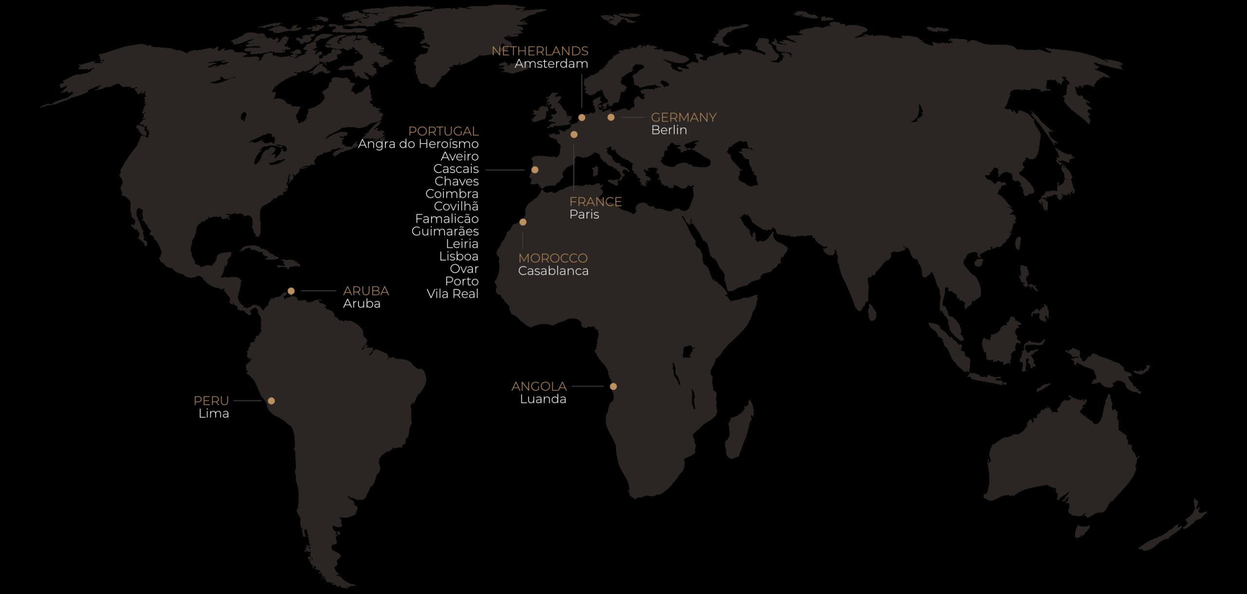 The network AFRICA ANGOLA LUANDA MOROCCO CASABLANCA AMERICA ARUBA ARUBA PERU LIMA EUROPE FRANCE PARIS GERMANY BERLIN NETHERLANDS AMSTERDAM EUROPE PORTUGAL ANGRA DO HEROÍSMO AVEIRO CASCAIS CHAVES COIMBRA COVILHÃ FAMALICÃO GUIMARÃES LEIRIA LISBOA OVAR PORTO VILA REAL